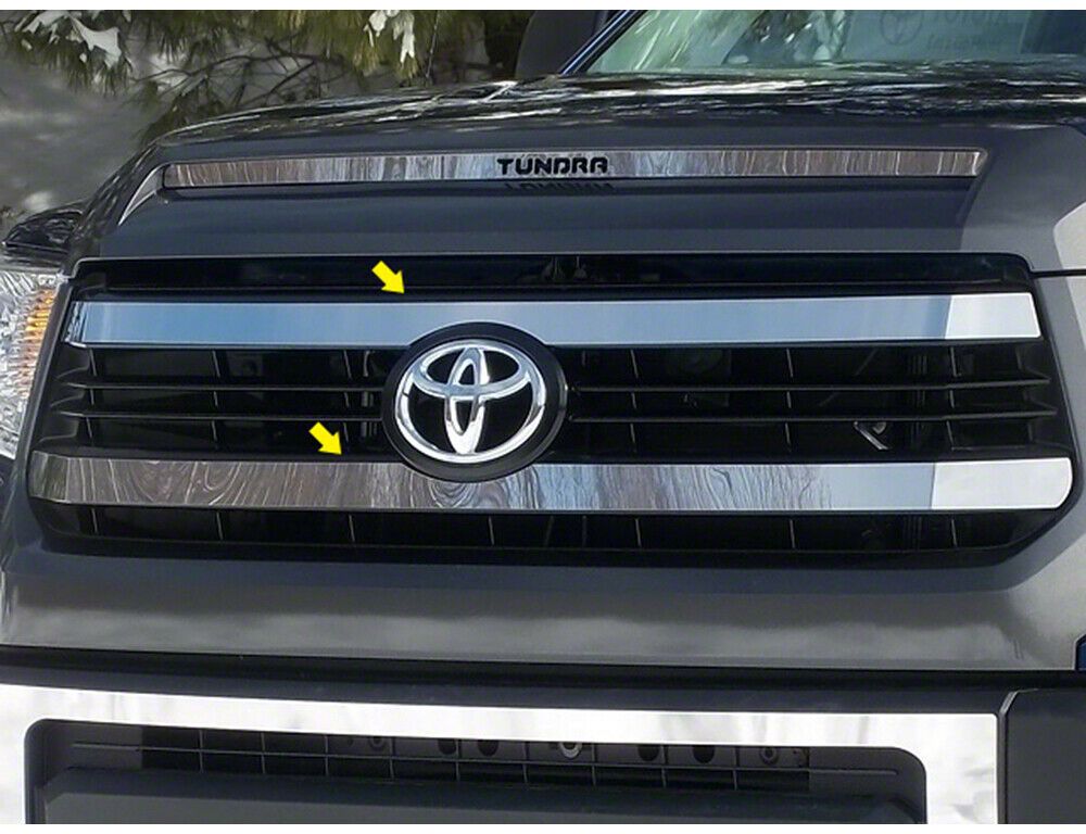 Application. These Stainless Steel Front Grille Accent Trims are specifically designed to be used on all 2014 to 2021 Toyota Tundra models.
