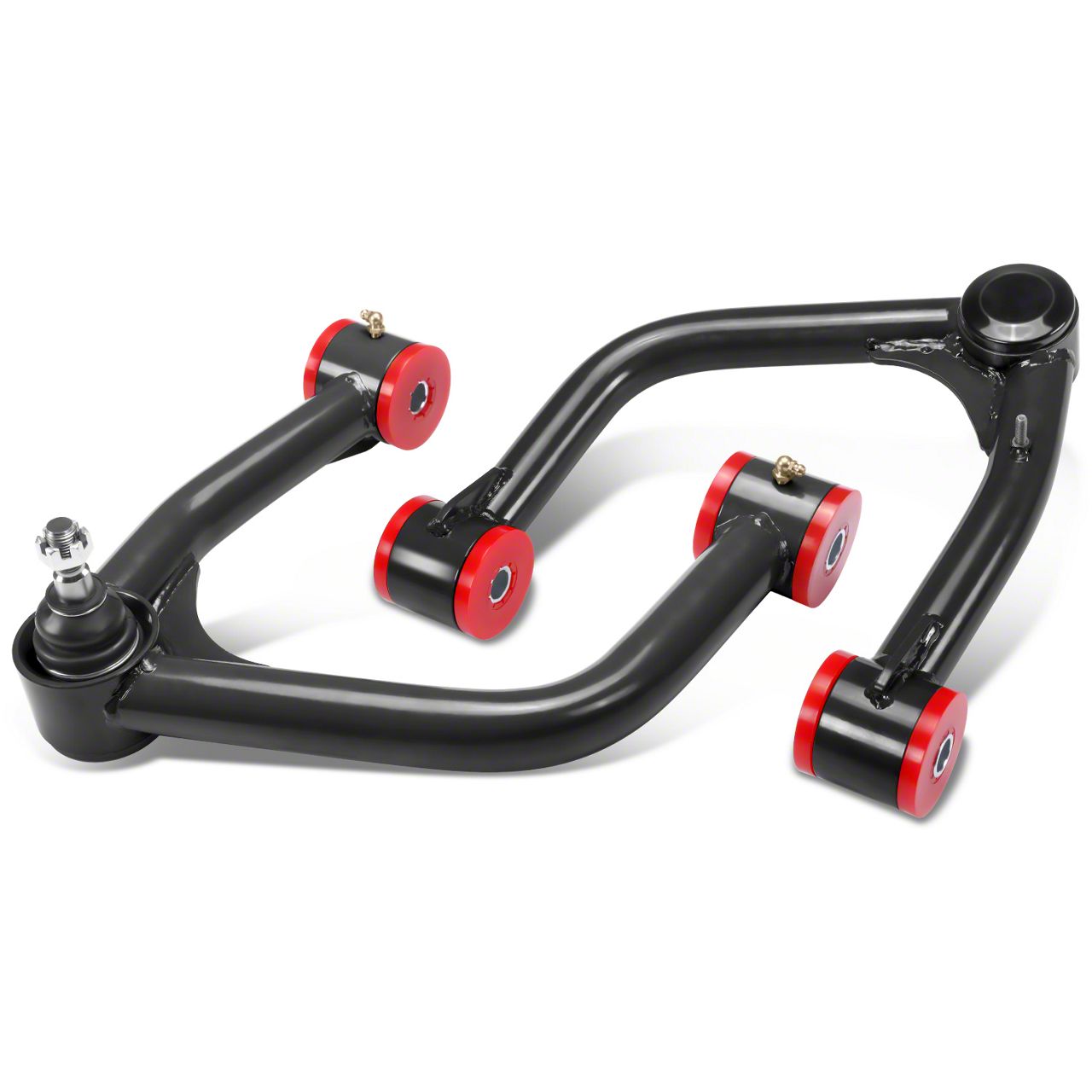 Construction and Appearance. Crafted with precision TIG-welding, these control arms are built for durability and performance. The matte black and racing red finish adds a bold and stylish touch, while the greaseable Zerk fittings ensure smooth operation and extended lifespan. Their OE-compatible design guarantees a perfect fit and dependable performance under tough driving conditions.