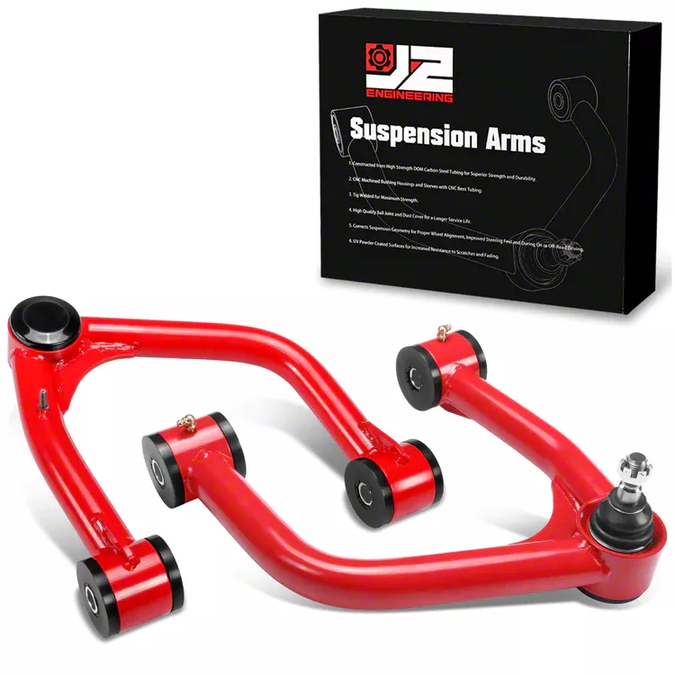 Superior Suspension Upgrade. The Front Upper Control Arms are constructed with a combination of copper and steel materials, ensuring both durability and strength. The CNC-machined and heat-treated features guarantee precision and resilience, while the red powder-coated surface offers corrosion resistance and a sleek appearance. With a drilling-free installation process, these control arms are easily integrated into your vehicle, enhancing suspension performance and alignment capabilities. The incorporation of pre-greased ball joints and high-quality PU bushings ensures smooth operation and longevity, making this upgrade essential for achieving superior handling and stability.