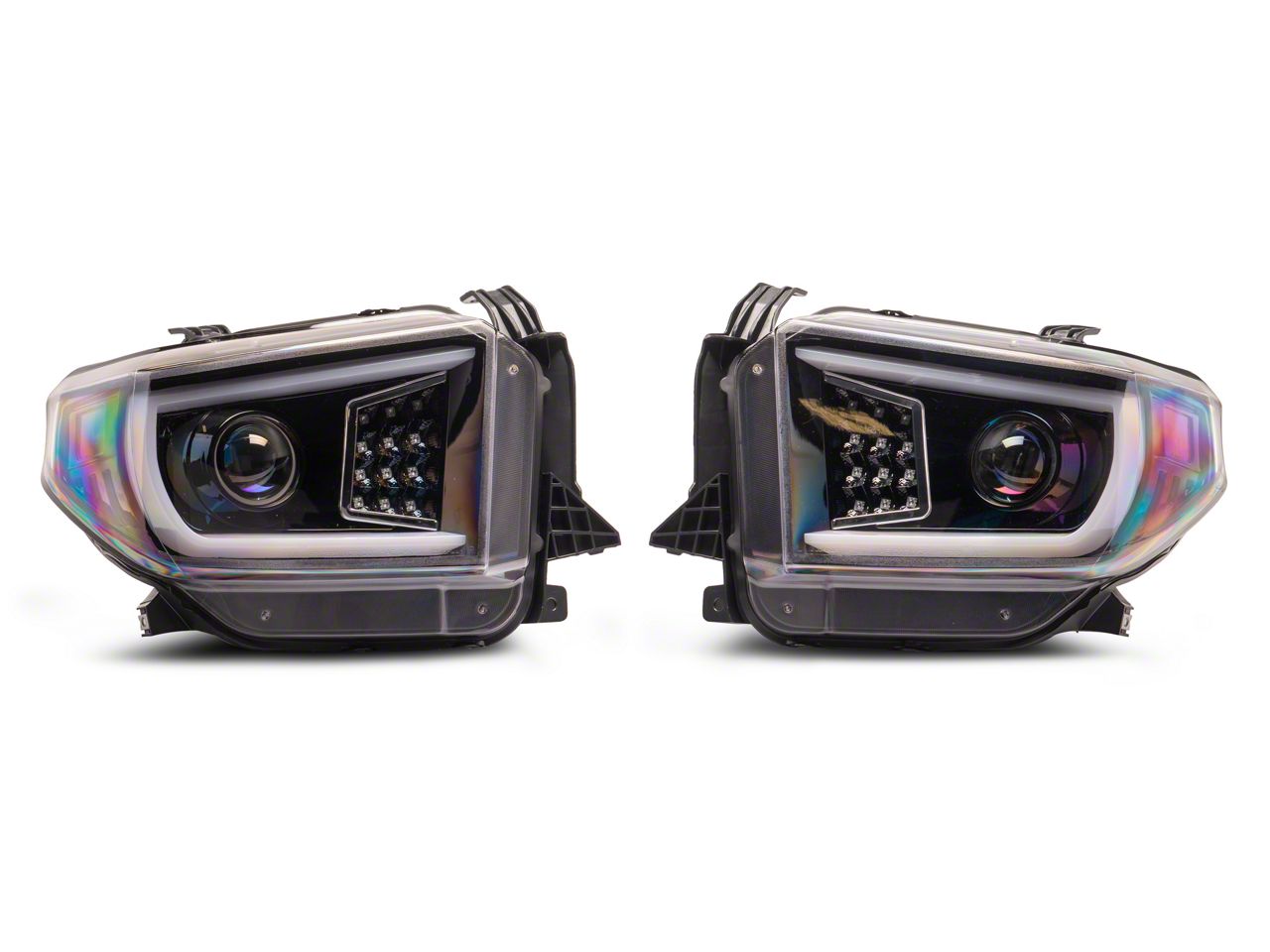 Application. These Projector Headlights with Sequential Turn Signals; Jet Black Housing; Clear Lens are designed to fit 2014-2021 Toyota Tundra models with Factory Halogen Headlights. Not compatible on models equipped with LED Strip and/or Level Adjuster Motor.