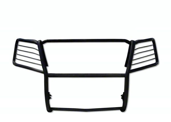 Outstanding Front-End Protection. This Grille Guard in Black provides superior front-end protection with remarkable style. It features a single-piece, wraparound design that delivers a beefier appeal to your work truck. With this grille guard, you can take your vehicle to aggressive adventures more fearlessly than ever.
