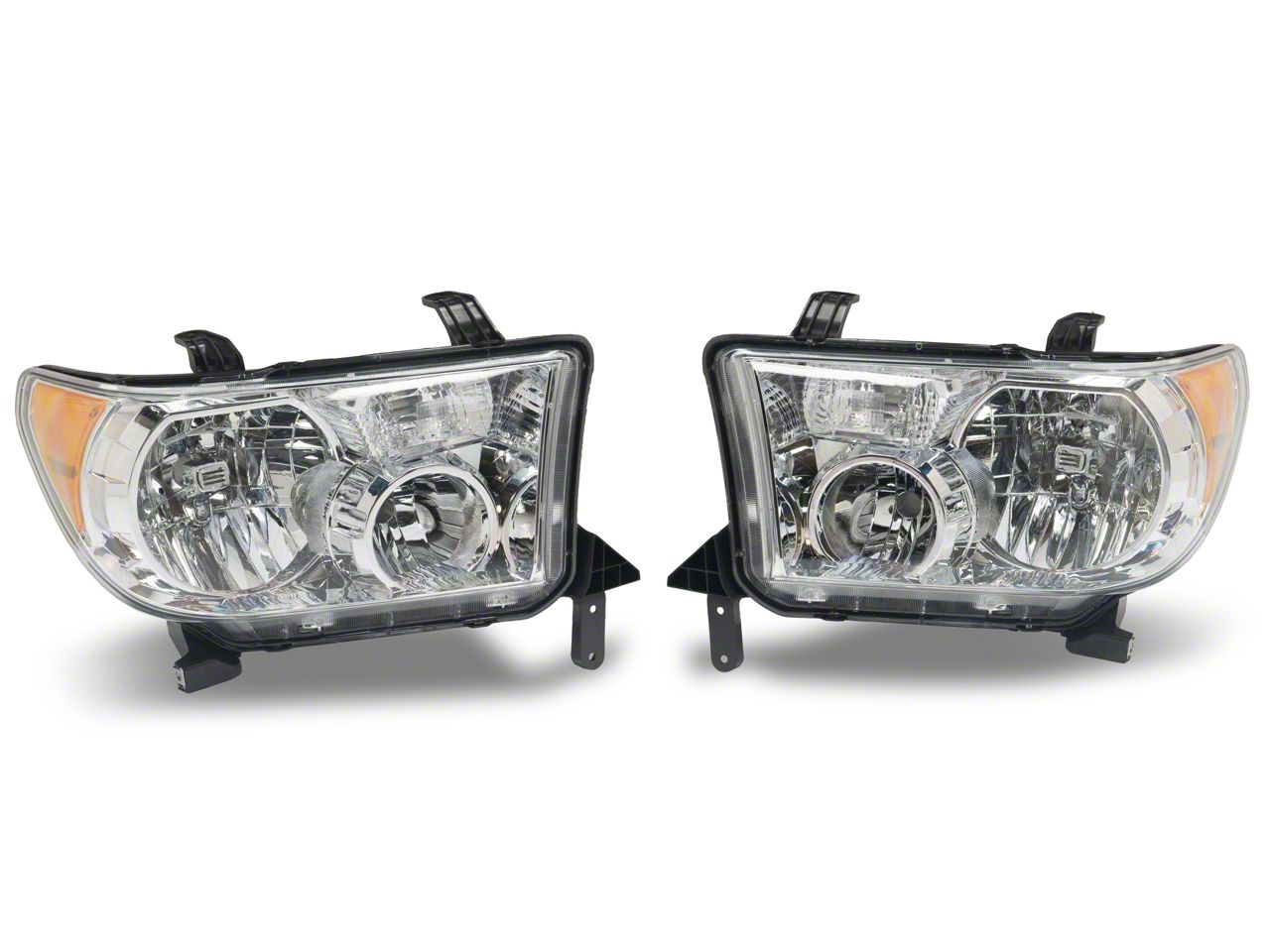 Superior OE Replacement. Replace damaged or worn-out headlights with these Chrome Headlights with Amber Corners. These headlights feature an OE-grade design, ensuring you maintain your Tundra’s impressive factory styling. Moreover, the headlights’ chrome look and projector-style high-beam lenses ensure road illumination remains at the same high quality.