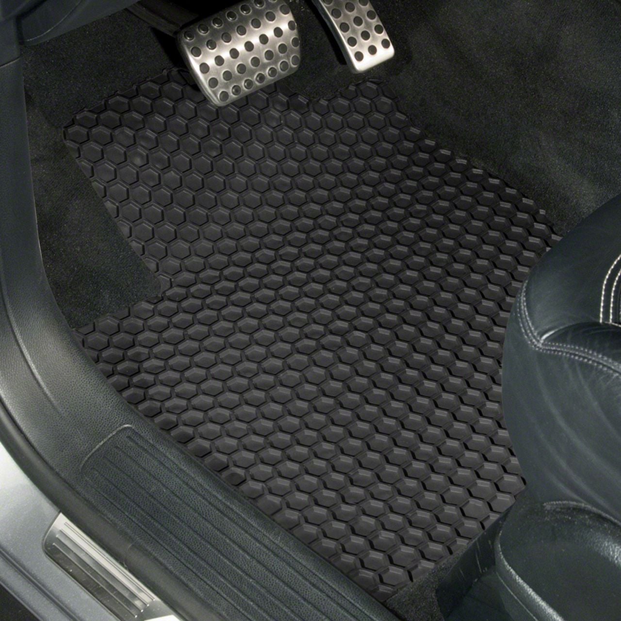 Construction and Features. Crafted from high-quality rubber, these floor mats feature a matte black finish and a hexagonal surface design that effectively traps dirt, mud, and spills. Engineered for all-weather use, they ensure durability in extreme conditions. Integrated grommets keep the mats securely in place, preventing movement while driving.