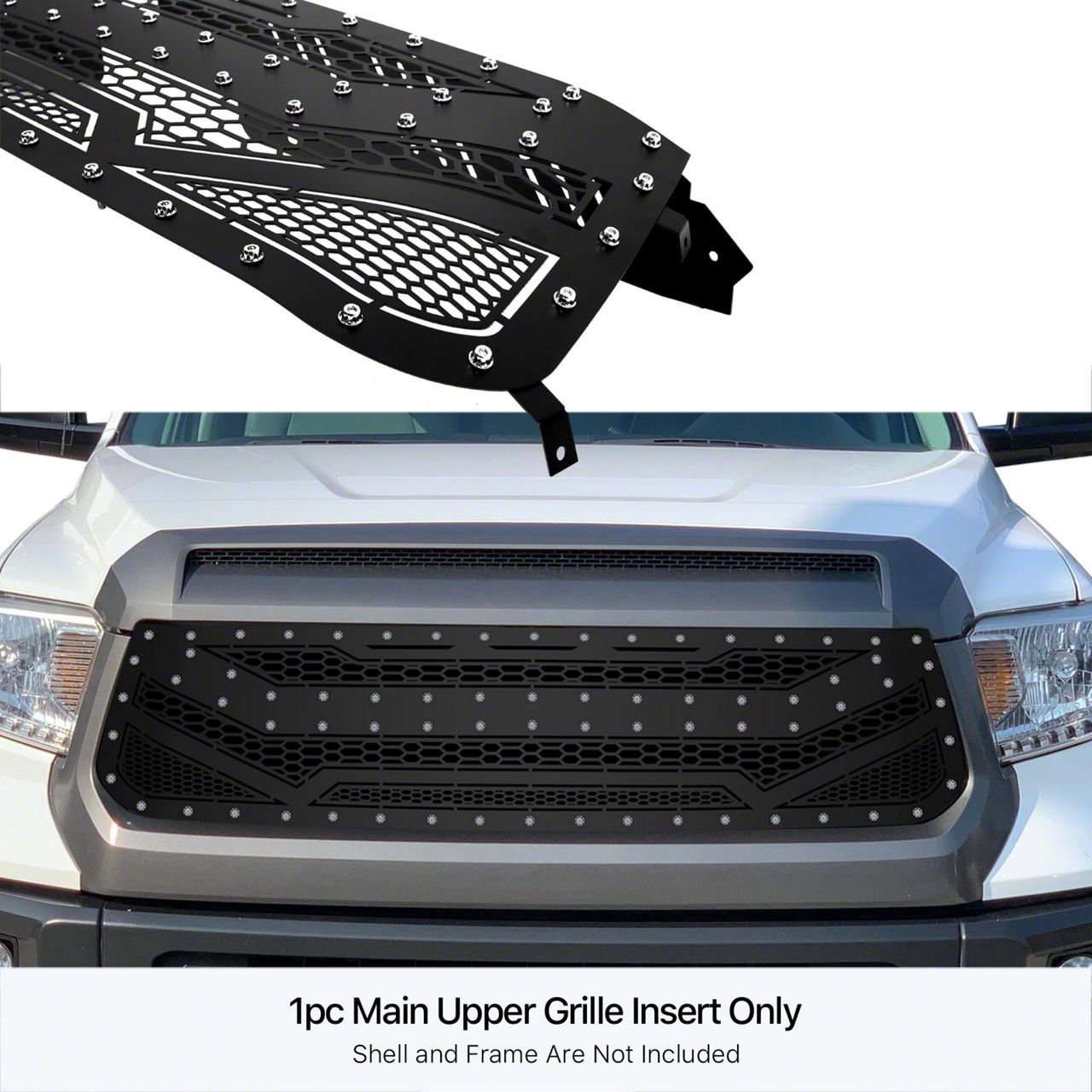 Bold Front-End Styling Upgrade. The Laser Cut Rivet Mesh Upper Replacement Grille brings aggressive styling and enhanced protection to your 2014–2017 Toyota Tundra. Designed to replace the factory grille, this high-performance mesh grille features a rugged riveted perimeter and precision laser-cut steel that stands out while still providing functional airflow to your engine bay. It's the perfect upgrade for truck owners looking to elevate appearance and durability.