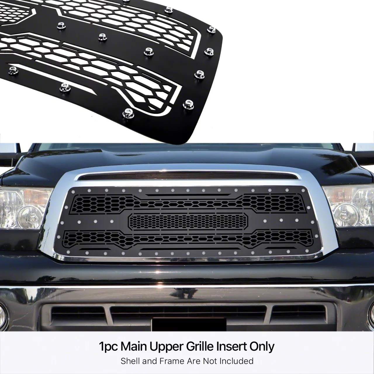 Application. This Laser Cut Rivet Mesh Upper Replacement Grille fits 2010 to 2013 Toyota Tundra models.