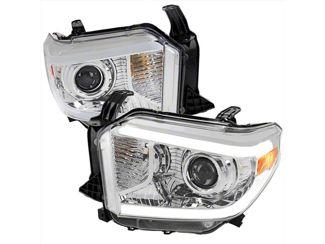 Construction and Appearance. With a sleek Chrome housing and clear lens, these LED Bar Projector Style Headlights are designed to not only improve visibility but also add a modern, sophisticated look to your vehicle. The construction adheres to strict OEM specifications, ensuring a perfect fit and long-lasting performance. The integrated switchback function and sequential turn signals make these headlights a standout addition to any Toyota Tundra.