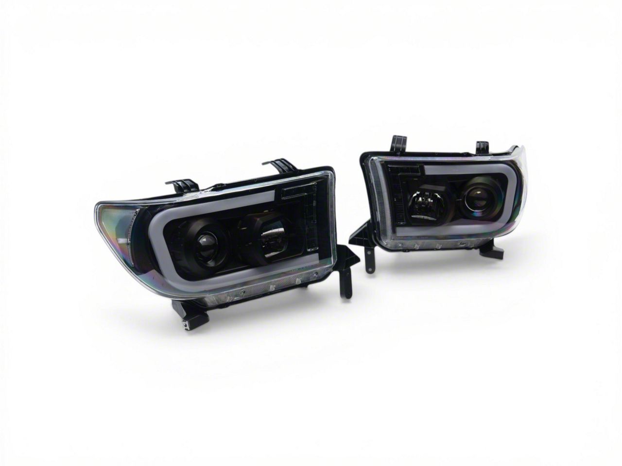 Modern Styling. Change up the appearance of your Toyota Tundra with a pair of Black Projector Headlights that feature Daytime Running Lights and clear corner reflectors. With an impressive design, these Headlights flow nicely with the lines of your Tundra's front end.