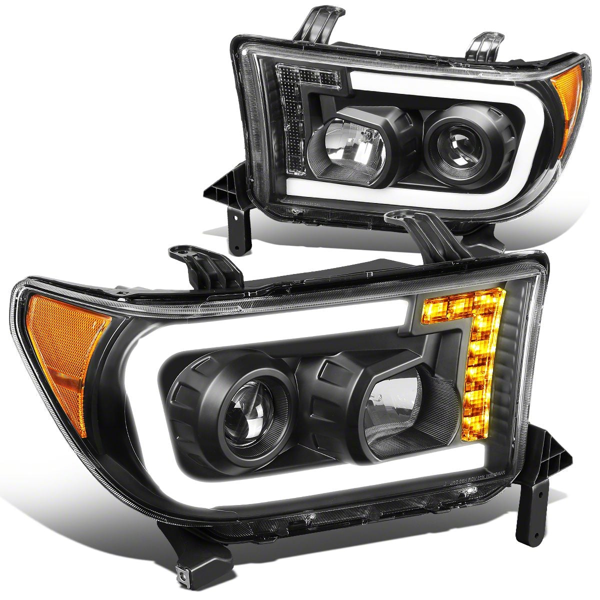 Updated Headlight Style. Give your Tundra a contemporary makeover with these LED DRL Projector Headlights with Amber Corners; Black Housing; Clear Lens. These headlights totally change the look of your early model Tundra with added functionality to boot. With projector lenses and LED DRLs, these headlights will make your truck look and feel mighty fine.