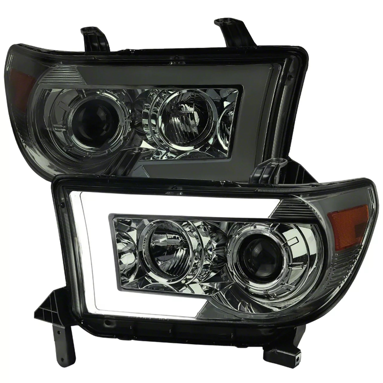 Application. These LED Light Bar Switchback Sequential Projector Headlights with Gloss Black housing are made to fit 2007-2013 Toyota Tundra models without level adjusters.