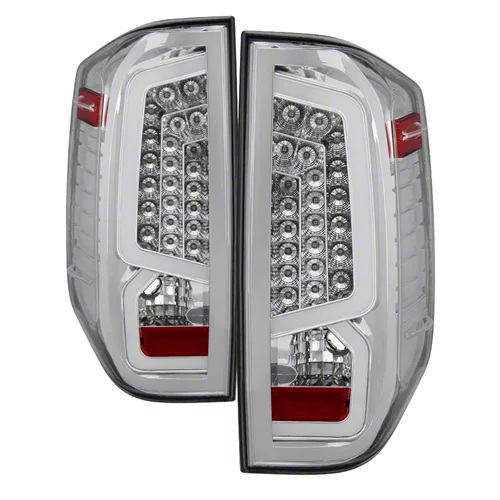 Modern Styling. These chrome Light Bar LED Tail Lights will add an updated modern appearance to your Toyota Tundra. Featuring a uniquely shaped white running light bar that illuminates red, these LED Tail Lights will make an impactful statement. Whether your Tundra is your daily driver, a dedicated work truck or your weekend toy, these Light Bar LED Tail Lights will be sure to set your Toyota apart from all the rest.