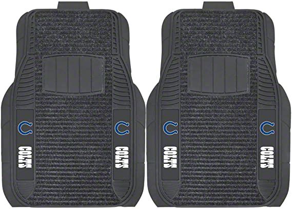 Application. These Molded Front Floor Mats with officially-licensed Indianapolis Colts logo feature a universal design so they will fit most makes and models of vehicles. These Mats can be trimmed to fit if necessary. Sold as a set of two Mats.