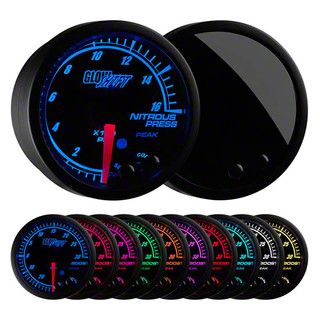 This 2 1/16" (52mm) 1600 PSI nitrous pressure gauge includes some incredible features like, a peak recall function, programmable high and low warning functions, stepper motor technology, 10 color through dial LED lighting, as well as a self-calibration mode at startup, an illuminated red needle, and a low profile magnified tinted lens. The adjustable high and low warning functions will alert you visually or with an optional audible tone, ensuring your nitrous pressure is not running to too high, and the peak recall function gives you instant vehicle feedback. The included stepper motor allows all needle movement to be incredibly smooth and all gauge readings to be exceptionally accurate. GlowShift’s 10 color through dial lighting allows you to match your stock gauges or add a custom look to your vehicles interior, and with the color recall feature you won’t have to worry about resetting the gauge to your preferred color every time your vehicle is turned on. This nitrous pressure gauge will also dim 30% when connected to your factory headlight switch, making it easy to read while driving at night.
