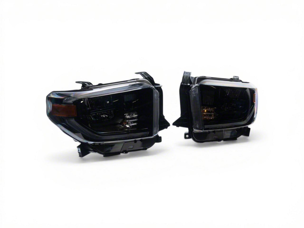 OEM Style Replacement Headlights. Replace your old weathered, cracked or damaged factory headlights with a brand new pair of OEM Style Full LED Headlights to improve your nighttime visibility. These Headlights feature a clean OEM design with black housings and clear lenses that will retain your Toyota Tundra's factory appearance.