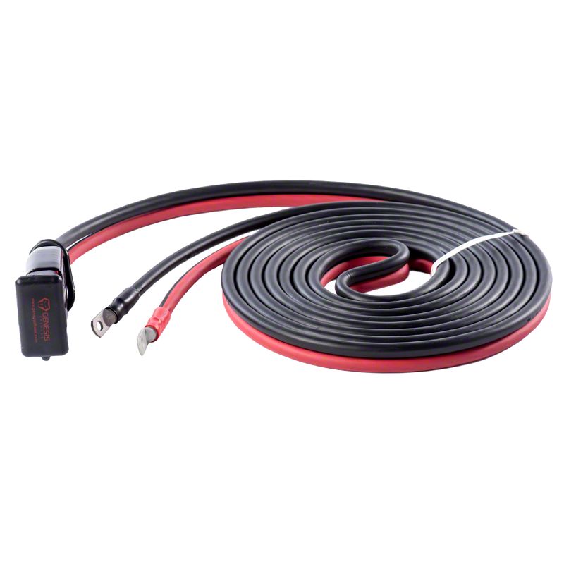 If you do not have a Genesis dual battery kit, simply connect the lugs to your battery's positive and negative post clamps. Route the cable along the frame rail, securing it away from heat or abrasion, and mount the plug on your rear bumper by your hitch. If you need to connect to a battery in a trailer, use the Genesis Offroad shorter 7 foot cable from the trailer battery to the tongue.