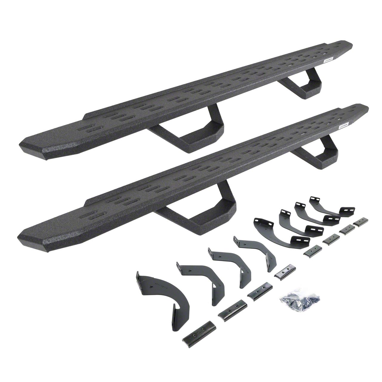 Installation. The Go Rhino RB30 Running Boards with Drop Steps; Protective Bedliner Coating bolt onto existing mounting points under the vehicle’s chassis. No drilling is required if using OEM locations.