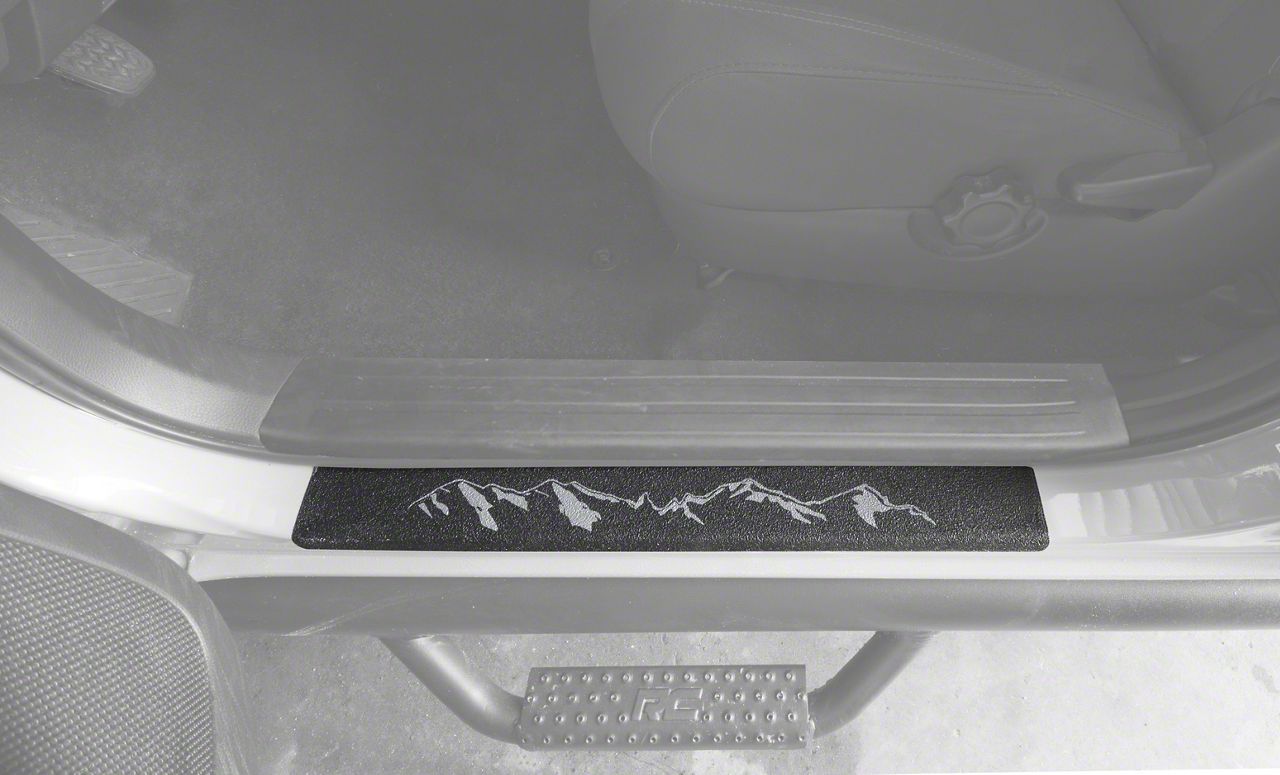 Interior Look. Take care of a spot less considered with this Rear Door Sill Protection with Mountain Logo; Textured Black. Your Tundra will thank you and the 2 pieces are perfectly designed to go on top of each door entry sill, adding style and protection.