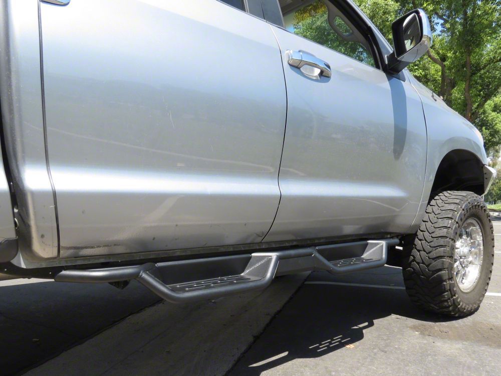 For Stable and Secure Cab Access. Feel comfortable whenever you enter or exit your Toyota Tundra with these Round Tube Drop Style Nerf Side Step Bars in Black. Featuring a sleek drop style nerf design, these side step bars help keep your footing stable to avoid slipping or falling accidents when accessing your truck. They also boast a heavy-duty construction to provide you with durable stepping areas you can rely on no matter how rough the trails get.