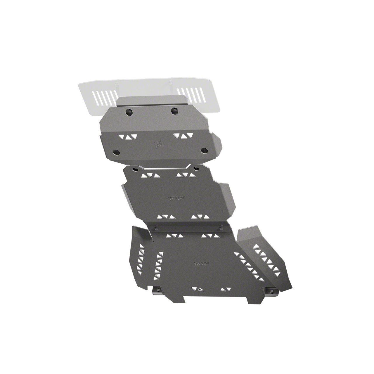 Construction and Design. Built from TIG welded 1/4-inch raw aluminum, this skid plate assembly is engineered for strength without unnecessary weight. The modular three-piece design allows for improved coverage and easier servicing when needed, while maintaining structural rigidity. Its aluminum construction offers excellent resistance to corrosion and impact, making it well-suited for demanding driving environments.
