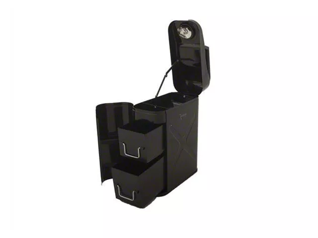 Construction and Appearance. This Trail Can Utility/Tool Box is compatible with a 5-gallon jerry can mount and underwent a thorough metal construction. It's resilient and black. It measures 18 inches (L) x 13 inches (W) x 6 inches (T).