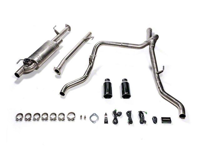 Controllable. Introducing the Valvetronic Dual Exhaust System with Black Chrome Tips - the perfect way to upgrade your 2013-2021 5.7L Toyota Tundra's exhaust system. This unique system features an electronically controlled valve that allows you to easily adjust the sound level from quiet to loud, and its modular design means it will work perfectly with your OEM headers.