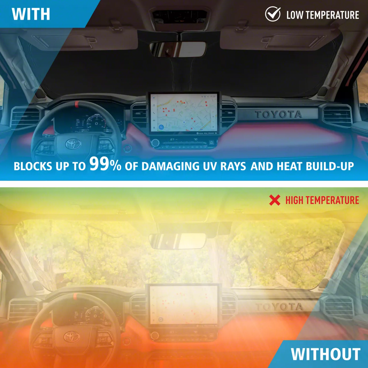 Long-Lasting Deflector. Protect your Tundra from harmful sun and UV rays with our Windshield Sun Shade. This sun shade is designed to effectively deflect sunlight, helping to prevent heat from getting inside your vehicle. Made from hard-wearing and long-lasting material, it ensures durability and reliability for long-term use, while keeping your car's interior cool and comfortable during hot summer days.