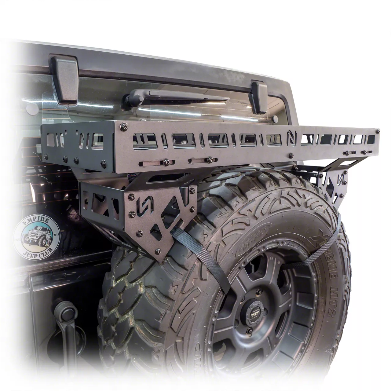 Application. The Turn Offroad Universal Spare Tire Storage Rack offers universal fitment.