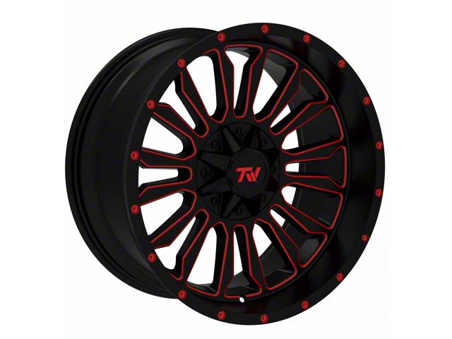 TW Offroad T6 Speed Gloss Black with Red 6-Lug Wheel; 20x10; -12mm Offset. The TW Offroad T6 Speed Gloss Black with Red 6-Lug Wheel; 20x10; -12mm Offset features a sleek and modern design that enhances the overall aesthetic of any vehicle. Its brushed gunmetal finish adds a touch of sophistication and complements various vehicle styles. This wheel's premium construction ensures durability and a robust appearance.