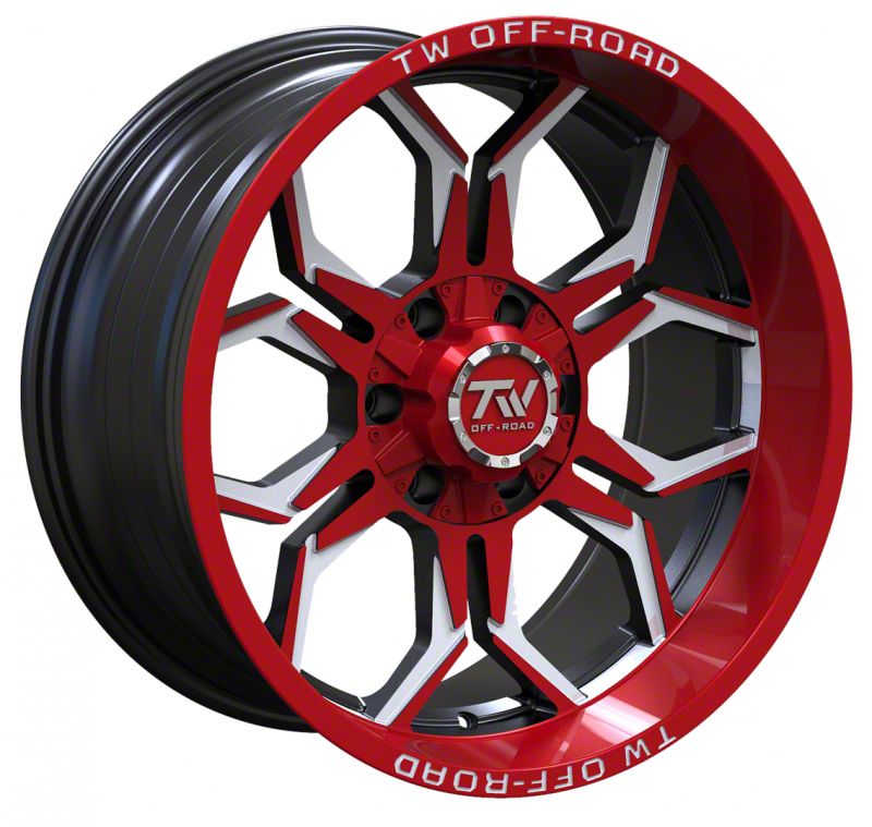 The 20x10 TW Offroad TF1 Black Machined with Red 6-Lug Wheel is completed in a high-quality gloss black machined finish with colored accents. For added protection and good looks, this Wheel features a durable, matte clear coat that is tough enough to stand up against the hazards of everyday driving.