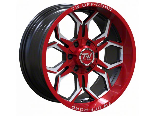 TW Offroad TF1 Black Machined with Red 6-Lug Wheel; 20x10; -12mm Offset This wheel offers a sleek and modern design that enhances the visual appeal of your vehicle. Its metallic gunmetal finish adds a touch of elegance and sophistication, making it a perfect fit for those who want to make a bold statement on the road.