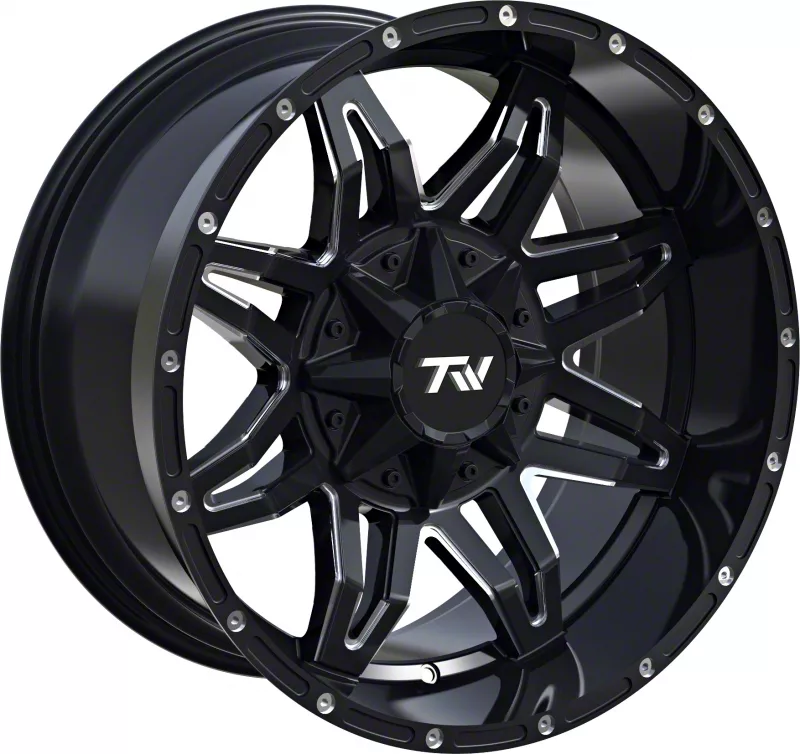 TW Offroad T2 Spider Gloss Black with Milled Spokes 6-Lug Wheel; 20x9; 0mm Offset. The TW Offroad T2 Spider Gloss Black with Milled Spokes 6-Lug Wheel; 20x9; 0mm Offset features a sleek and modern design that enhances the overall aesthetic of any vehicle. Its brushed gunmetal finish adds a touch of sophistication and complements various vehicle styles. This wheel's premium construction ensures durability and a robust appearance.