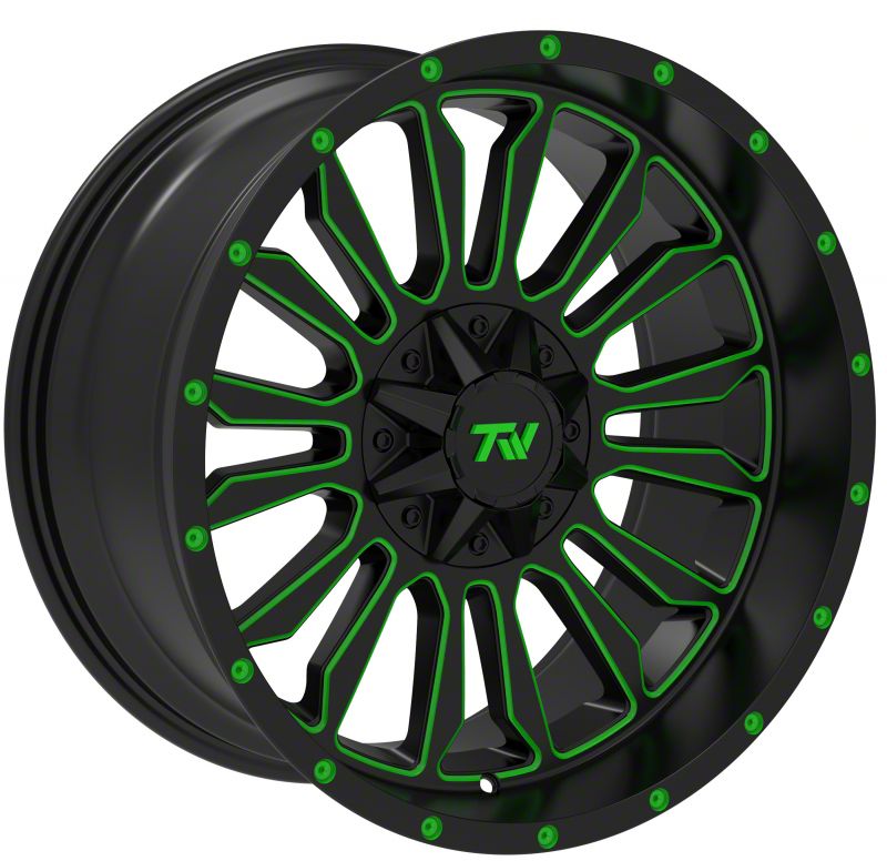 The 20x10 TW Offroad T6 Speed Gloss Black with Green 6-Lug Wheel; 20x10; -12mm Offset is completed in a sturdy, stunning finish that will be the envy of everyone. The finish has been thoroughly tested to make sure it can handle the rigors of daily driving.