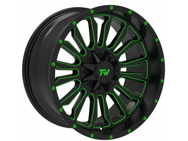 TW Offroad T6 Speed Gloss Black with Green 6-Lug Wheel; 20x10; -12mm Offset. The TW Offroad T6 Speed Gloss Black with Green 6-Lug Wheel; 20x10; -12mm Offset features a sleek and modern design that enhances the overall aesthetic of any vehicle. Its brushed gunmetal finish adds a touch of sophistication and complements various vehicle styles. This wheel's premium construction ensures durability and a robust appearance.