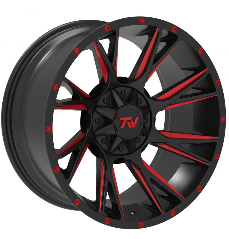 TW Offroad T12 Blade Gloss Black with Red 6-Lug Wheel; 20x10; -12mm Offset delivers a bold and modern aesthetic, ideal for enthusiasts seeking a refined yet assertive look for their vehicle. With its standout design and distinct finish, this wheel enhances the vehicle's visual stance and street presence. The precise craftsmanship and premium aluminum build reflect TW Offroad's dedication to quality and distinctive design. Whether parked or in motion, this wheel draws attention with its clean, aggressive styling.