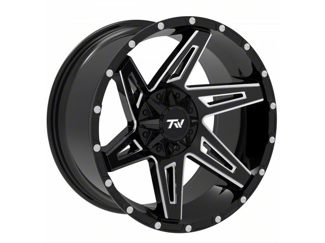 The 20x9 TW Offroad T4 Spin Gloss Black with Milled Spokes 5-Lug Wheel; 20x9 is completed in a high-quality gloss black finish with milled accents that will make others green with envy. For added protection and good looks, this wheel features a durable clear coat that can withstand the hazards of daily driving.