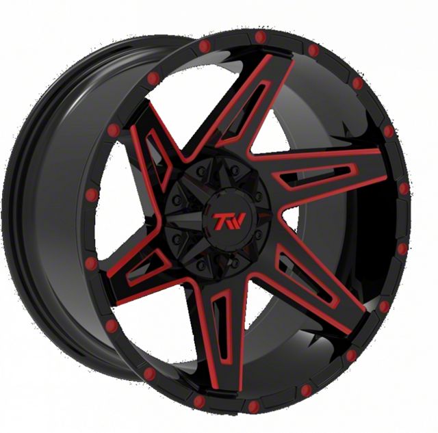 TW Offroad T4 Spin Gloss Black with Red 6-Lug Wheel; 20x9; 0mm Offset. The TW Offroad T4 Spin Gloss Black with Red 6-Lug Wheel; 20x9; 0mm Offset features a sleek and modern design that enhances the overall aesthetic of any vehicle. Its brushed gunmetal finish adds a touch of sophistication and complements various vehicle styles. This wheel's premium construction ensures durability and a robust appearance.