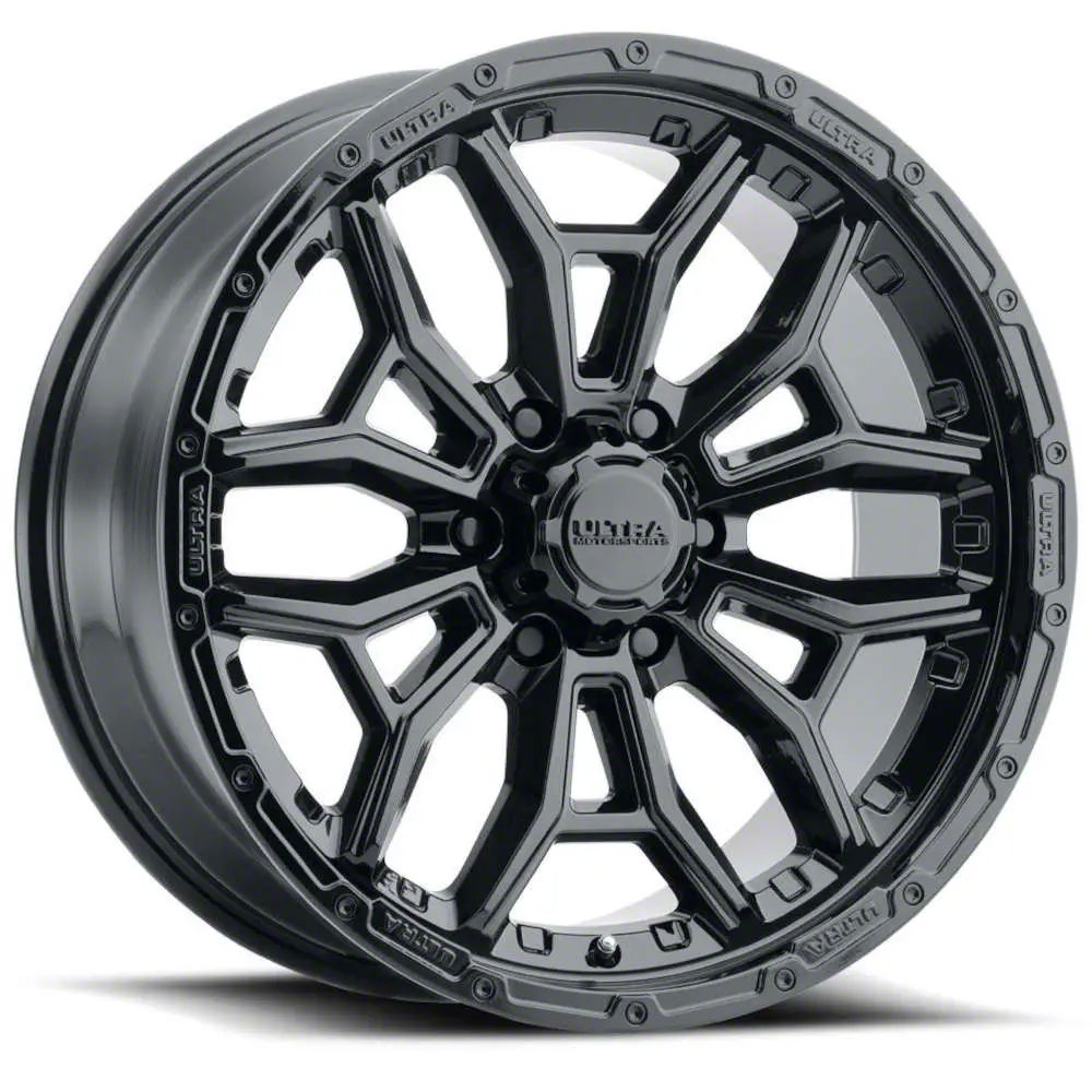 The 17x9 Ultra Wheels Warmonger 6 Gloss Black 6-Lug Wheel; 17x9; 18mm Offset is completed in a high-quality gloss black finish that will make others green with envy. For added protection and good looks, this wheel features a durable clear coat that can withstand the hazards of daily driving.