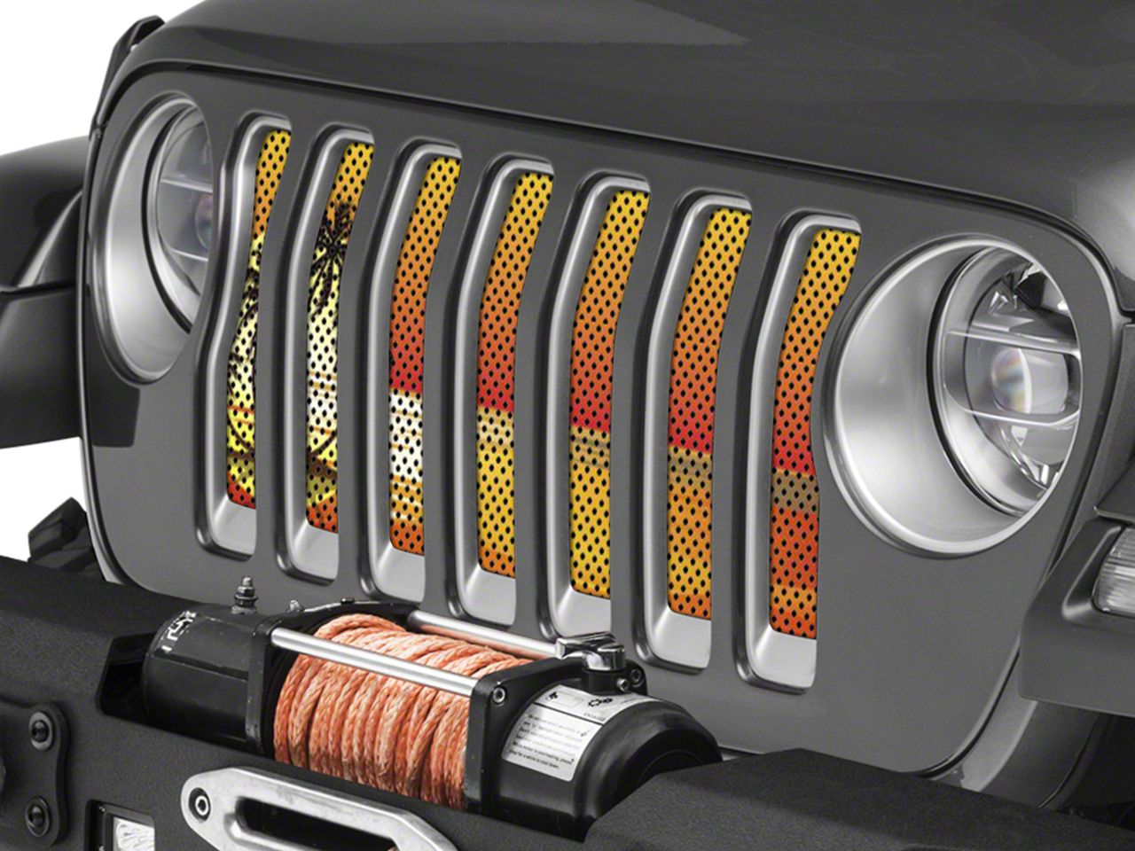 Vibrant Style Enhancement. The Grille Insert, adorned with an Endless Summer Orange Palm Tree Design, introduces a vibrant and distinctive aesthetic to your Jeep Wrangler JL. Proudly made in the USA with corrosion- and rust-proof features, combined with robust perforated aluminum material construction, ensure durability and a lasting impression.
