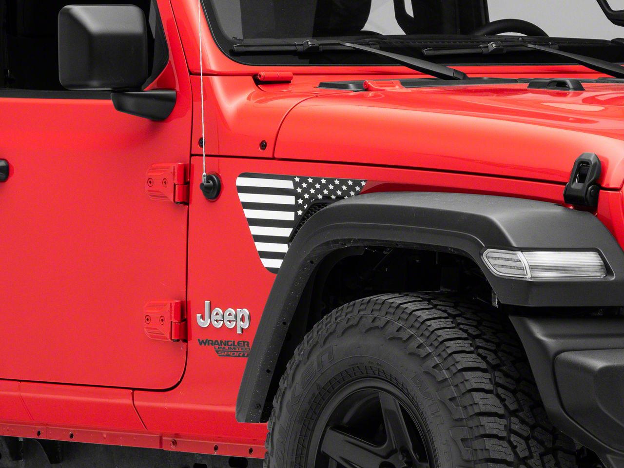 Application. These Under the Sun Black and White US Flag Fender Vent Decals are designed to fit 2020-2026 Jeep Gladiator JT models. Driver and passenger side included.