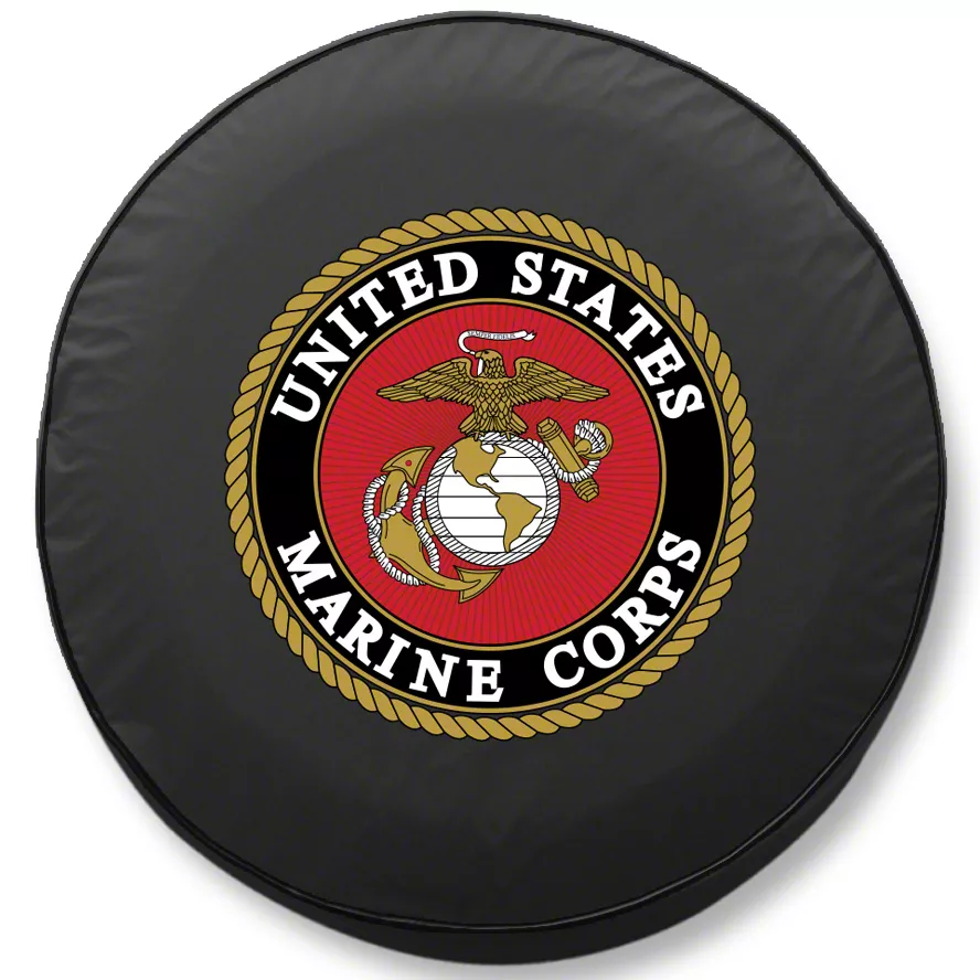 Military Wheel Cover. Show your support for the troops and protect your spare wheels from the elements with this U.S. Marines Spare Tire Cover; Black. Manufactured in multiple sizes, it features tough vinyl material to protect your tires from prolonged exposure to the elements, like rain and harsh sunlight, ensuring you have a fresh new wheel when you need it.