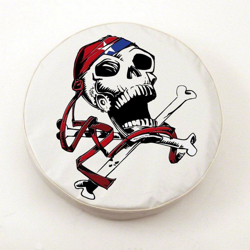 Hardcore Tire Styling. Be ready for emergencies while also giving a unique look to your Jeep with This USA Pirate Spare Tire Cover; White. Sporting a crisp aggressive graphic of the iconic pirate crossbones, it adds a strong personality to your vehicle while protecting your spare wheel from the elements. It is a stylish accessory that adds a strong look as well as coverage for various tire sizes.