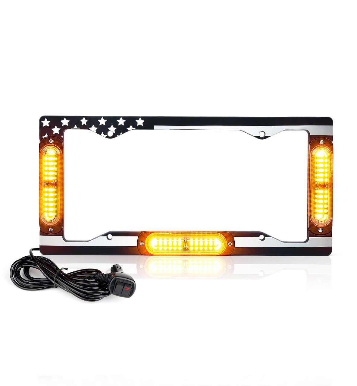 American Flag License Plate Frame with Amber and White Strobe Lights (Universal; Some Adaptation May Be Required)