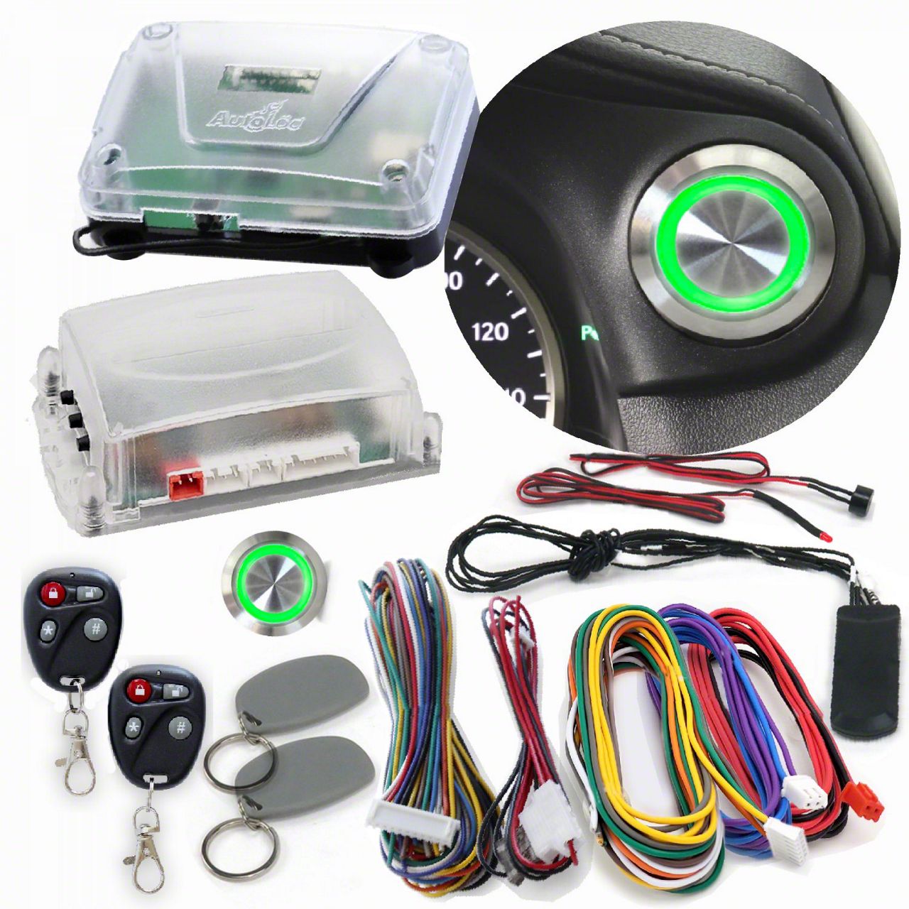 Kit includes: 12V non-illuminated billet aluminum push button switch, start/stop remote start control module, and keyless entry system with 2 remote key fobs and Bluetooth smartphone app.