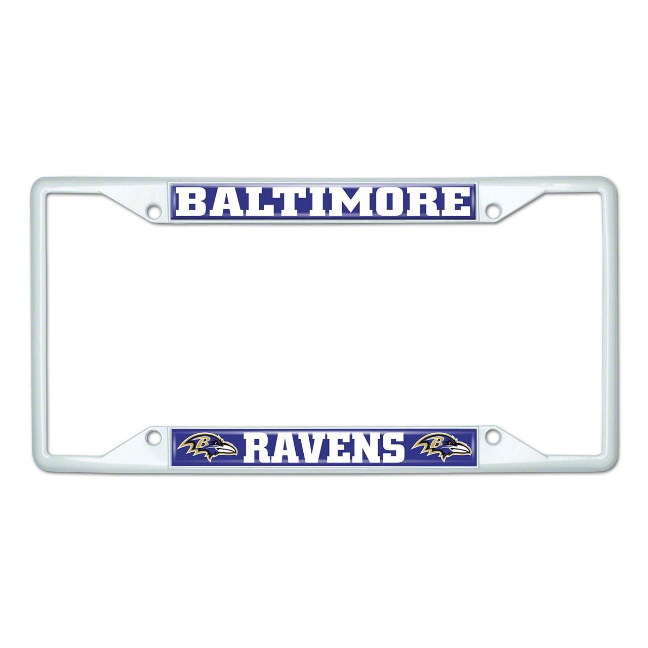 License Plate Frame with Baltimore Ravens; White (Universal; Some Adaptation May Be Required)