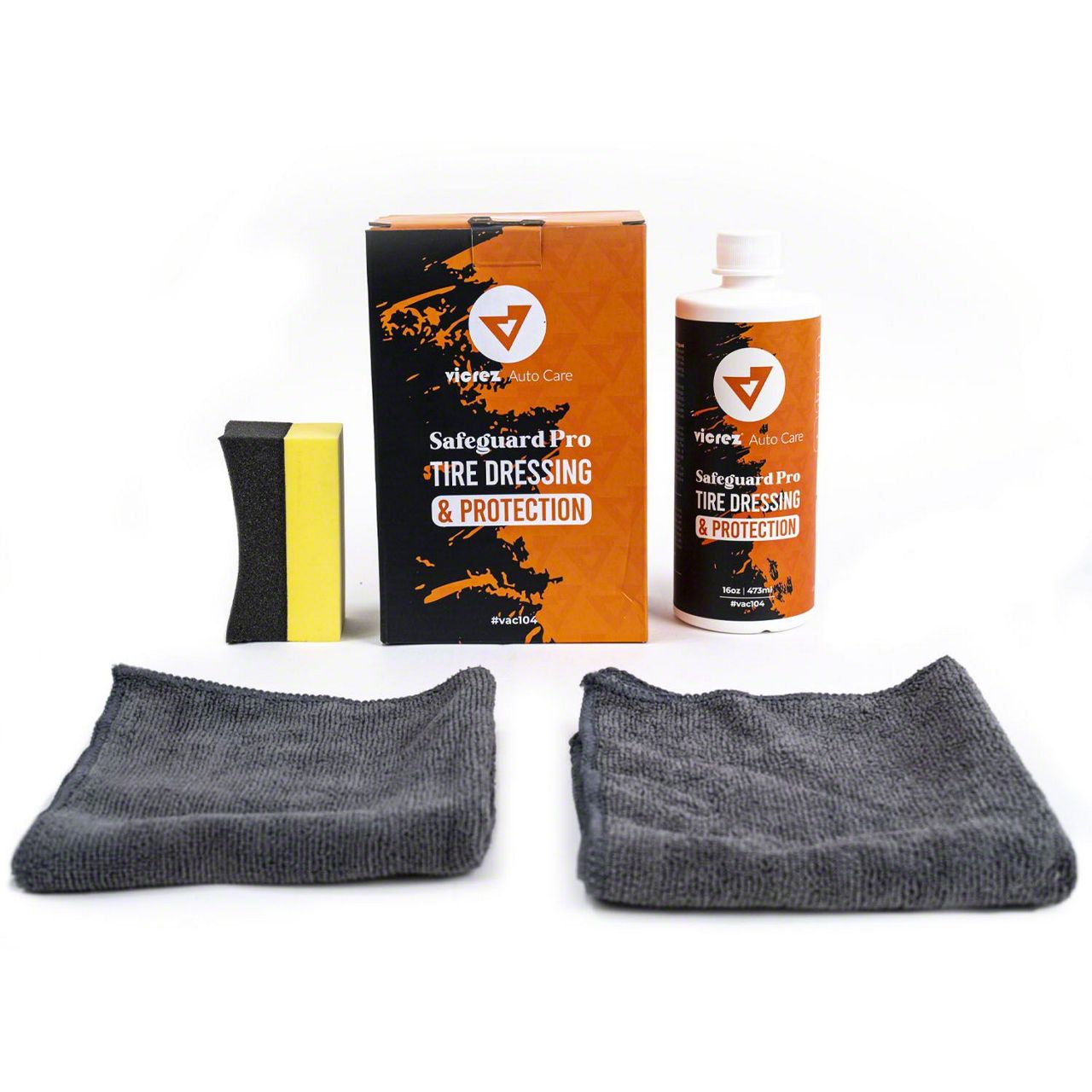 Introducing Vicrez Auto Care vac104 Safeguard Pro Tire Dressing & Protection, a premium product designed to keep your car tires looking newer, longer. Our specially formulated tire protectant will prevent fading and cracking caused by UV rays and will also protect from dry rot. Prolong the life of your car tires by conditioning and protecting them when driving and in storage. Unlike other spray-on tire shine products, Vicrez Auto Care Tire Dressing & Protectant offers a multi-layer benefit. Wipe one coat for a matte finish and two or more coats for a shine that will last for up to 3 weeks. Our water-based dressing is free of oil or greasy residue and features a sling-free formula, ensuring the product will stay on your tires and not make a mess while you're driving. The easy-to-use, long-lasting polymer formula is simple to apply, just wipe it on with a sponge applicator and watch your tires transform.For best resultsWe recommend using our Tire Dressing & Protectant on a regular basis, at least once a month or as needed to maintain the shine and protect your vehicle's tires.Directions:1. Apply it on a cool, clean tire, using the tire applicator pad of your choice.2. Spread it evenly across the tire and let it dry for about 10 minutes depending on conditions.3. Apply another coat (if desired) for a shinier look.Caution:In case of accidental ingestion, do not induce vomiting and seek immediate medical attention. If product gets into eyes, flush with water for 15 minutes and seek medical attention if irritation persists. If skin irritation occurs, wash affected area thoroughly with soap and water. Keep out of reach of children