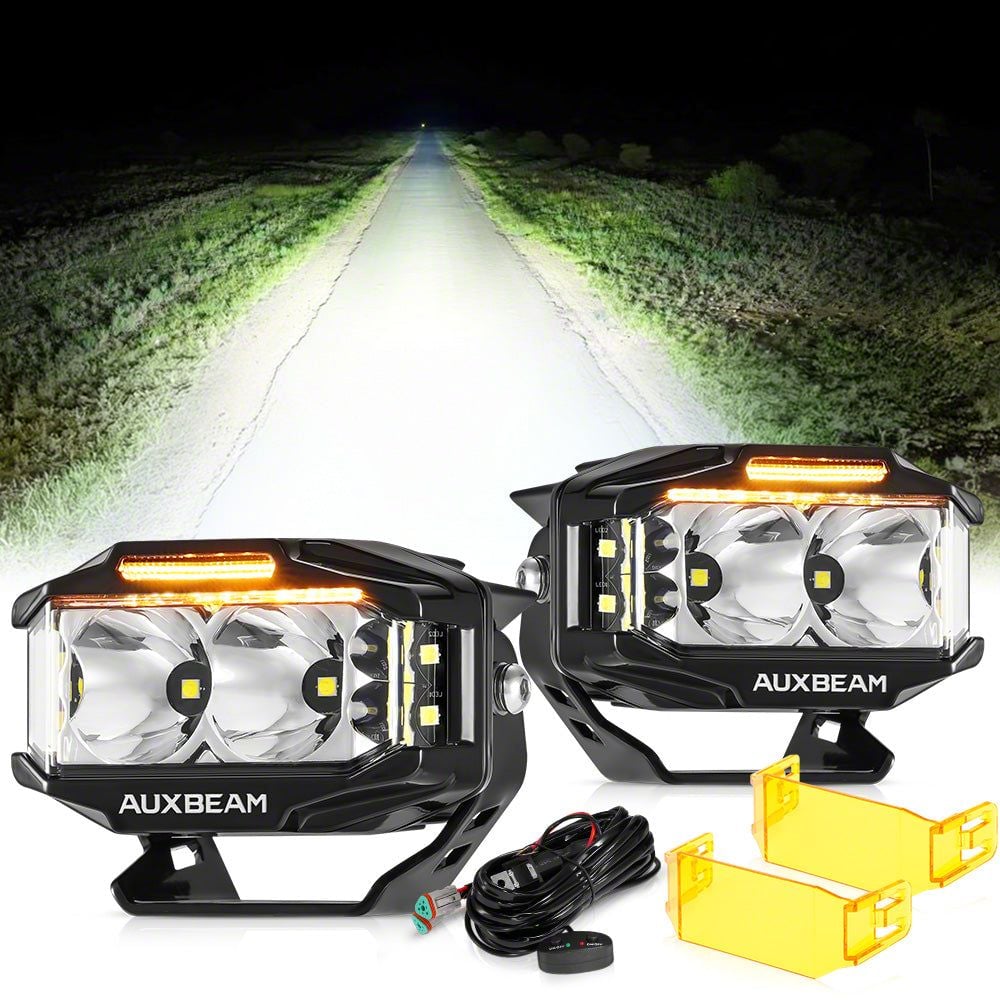 Features:Side Shooter Design: Designed with dual side lights to work together with front spot light. Light coverage to clear darkness and potential hazard, increasing your driving safety.Trusted Brightness: Employ top-notch led chips, total 36 watts per light, with lighting performance 3480LM/PCS. Features a trusted brighter long-lasting light, and a clearer, wider, and further visual area. Lifespan extends over 50,000H.3 Light Modes: Side shooter light and front spot light together are main lighting mode to provide a clearer, wider and further visibility for your night time driving. While amber DRL is a daytime lighting mode to add extra safety by capturing other drivers' notices of your presence on the road. Both modes can be used simultaneously.Combining three modes, it’s the perfect light to ensure your safety throughout the whole day.Easy Installation: Our LED lights come with a plug-and-play wiring harness kit.Say goodbye to the tedious installation process and hello to hassle-free lighting.Wide Application: Side shooter LED Lights fits in most vehicles with 10-24V DC power,Such as Trucks Jeep Boat Trailer ATV Off road vehicles, 4x4, Toyota, SUV, Mining, Boating, Farming and Heavy Duty, motorcycle etc.Specification:Shape Size: 4 InchLamp Beads Model(Each): P8 5W/PCS*6+3030 SMD 6WPower/Set: 36W * 2(Spotlights 30W+Amber DRL 6W)=72WTotal Lumens: 6960LM(6000LM+Amber DRL 960LM) Beam Pattern: Spot Light+Double-Side Shooter LightColor Temperature: 6500K White/3000K AmberLight Distance: 1 LUX@198MLight Color: White+Amber DRLWith EMC/EMI: YesHousing Material: Aluminum AlloyLens Material: PCLife Time: 50000+ hoursHousing Color: BlackWaterproof Rate: IP68Fit Model: Universal(M10 screw mounting)Working Voltage: 10V-30V(Wiring harness Relay is 12V only, can be replaced with 24V)