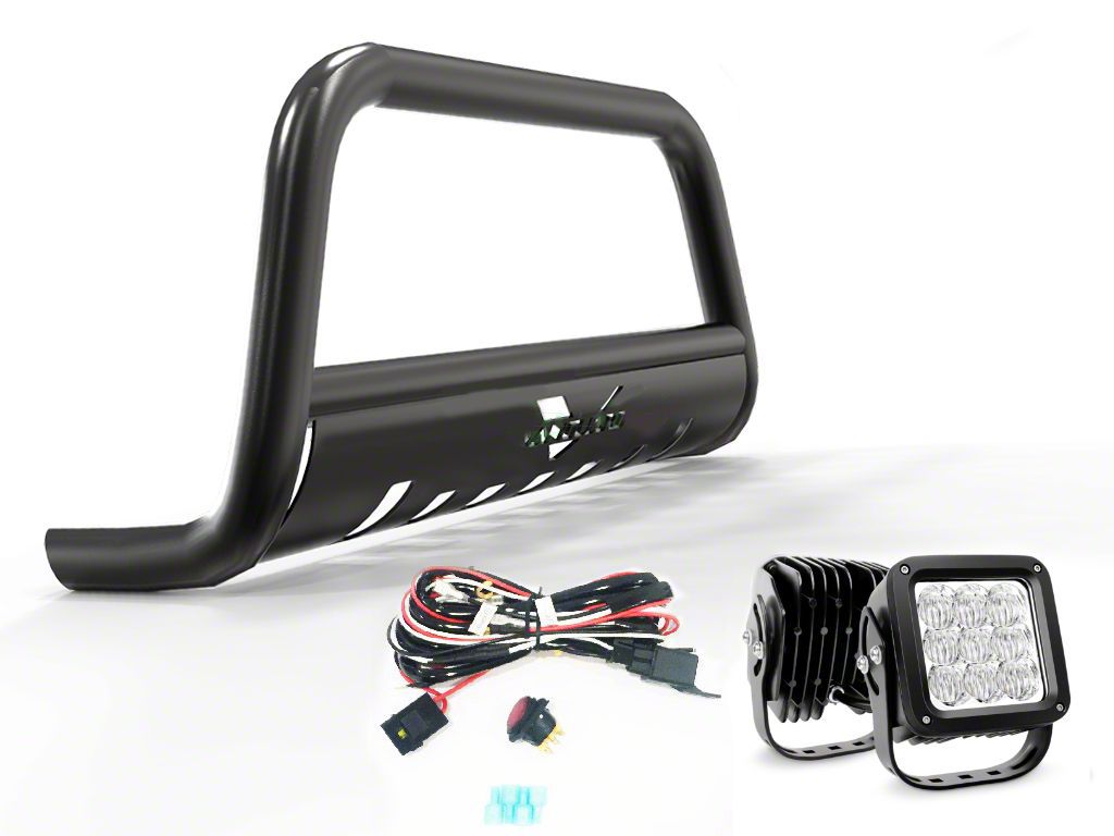 Superior Front-End Protection. Elevate your vehicle's protection and style with the Bull Bar with 4.50-Inch LED Cube Lights; Black. This robust accessory is designed to provide superior front-end protection, going beyond what regular bull bars offer. It's not just about looks; it's about safeguarding your vehicle from unexpected road debris and impacts. The bull bar features a skid plate with a laser-cut Vanguard logo, offering excellent shielding against debris encountered during your travels. Moreover, it's equipped with pre-drilled holes, making it easy to add auxiliary lights for enhanced visibility during nighttime adventures.