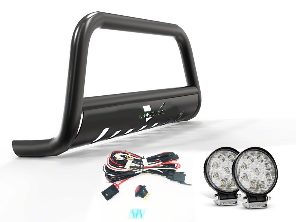Sturdy Bull Bar with LED Lights. The Bull Bar with 4.50-Inch Round LED Lights (Black) provides superior protection and functionality for your vehicle. It is designed to shield the front end from road debris while offering enhanced visibility with integrated LED lights, making it a great addition for off-road adventures or nighttime driving.