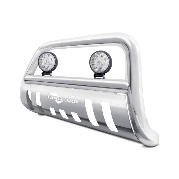 Aesthetic and Quality. Your front end is the first thing most people see when they look into your vehicle, so any extra protection to maintain its quality is always a good thing. The Bull Bar with 4.50-Inch Round LED Lights (Stainless Steel) protects your front end from damaging debris and minor collision without obstructing the front grille. It has a skid plate to safeguard your undercarriage and a pair of 4.50-inch round LED lights for added illumination, especially at night.