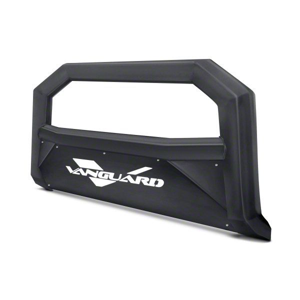 Durable Structure. Crafted with precision using 3-inch extruded aluminum, the Vanguard Off-Road Optimus Wide Bull Bar ensures superior strength without adding unnecessary weight. Its sleek and bold appearance is complemented by a durable finish, featuring an electrophoretic black primer combined with a black powder top coating, ensuring resistance against corrosion and abrasion for long-lasting use in various weather conditions. Additionally, the bull bar comes equipped with a skid plate, proudly displaying the laser-cut Vanguard logo, providing both added defense and a touch of style to your vehicle's front end.