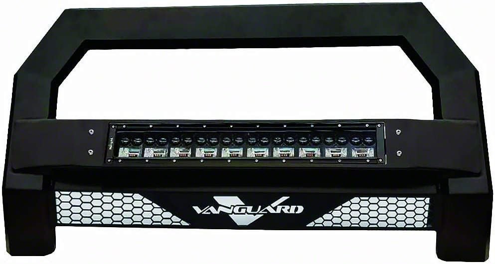 Ruggedly Stylish Bull Bar. Complete the off-road vibe of your Tacoma with the addition of this Vanguard Off-Road Vantage Bull Bar with a 22-Inch LED Light Bar in Black. This CAD-designed bull bar features a sleek geometric design that effectively blocks flying debris while protecting the radiator and other front components from impact. It comes with a brilliant LED light bar that adds to its stylish appeal and a skid plate to protect some of the undercarriage components at the front.